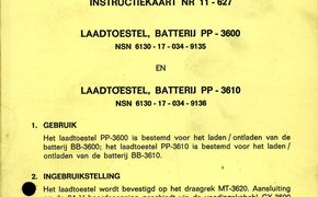 Laadtoestel, Batterij PP-3600. Laadtoestel, Batterij PP-3610. IK 11-627 Laadtoestel, Batterij PP-3600. Laadtoestel, Batterij PP-3610. Batterij, Laadbaar BB-3600. Batterij, Laadbaar BB-3610. de. IK 11-627 Laadtoestel, Batterij. PP-3600. Laadtoestel, Batterij. PP-3610. Batterij, Laadbaar. BB-3600. Batterij, Laadbaar. BB-3610. IK 11-627 Laadtoestel, Batterij PP-4530. IK 11-628 voor de bediening en het onderhoud van het laadtoestel, batterij PP-5409. IK 11-653 voor de bediening van het Laadtoestel, Batterij PP-6800. IK 11-670 voor de bediening van het Laadtoestel, Batterij PP-6800. IK 002002 Laadtoestel, Batterij PP-6405. OK/IK 002035 Wals batterijlader. IK 005923 Taaklijst periodiek onderhoud Laadinstallaties, Batterij PP-3602, PP-3612 en PP-3613. 1e echelons werkzaamheden aan niet in gebruik zijn installaties. OK 11-627/1 Batterij-Laadtoestel PP-3363. Onderhoud. 3/5 TH 11-612. Batterij-laadtoestel PP-3181. 1/5 TH 11-613.