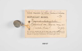 Standmodel van een kleine witmetalen knoop tbv leerlingen van S.V.O. volgens beschikking van 25 maart 1926 Standmodel van een kleine bronzen knoop volgens beschikking van 12 november 1928 Standmodel van een kleine geelmetalen knoop, volgens beschikking van 25 maart 1926 Standmodel van een kleine witmetalen knoop voor leerlingen van de S.V.O., volgens beschikking van 25 maart 1926 Duplicaatmodel van een witmetalen knoop voor hogere rang volgens beschikking van 17 augustus 1909 Standmodel voor een witmetalen knoop voor een hogere rang, volgens beschikking van 17 augustus 1909 Standmodel voor een geelmetalen knoop voor een hogere rang, volgens beschikking van 17 augustus 1909 Duplicaatmodel voor een geelmetalen knoop voor een hogere rang, volgens beschikking van 17 augustus 1909 Standmodel voor een broek van grijs laken Veldtenue voor beredenen, volgens beschikking van 1913 Duplicaatmodel van een rijbroek voor de Marechaussee, goedgekeurd bij beschikking van 4 februari 1929 Duplicaatmodel voor een overjas van veldgrijs laken voor een leerling/capitulant der beredenen van de Artillerie school Reserve of Intendance, volgens beschikking 12 oktober 1939 Standmodel voor een mantel, cape van grijze wol voor onderofficieren en minderen van de bereden wapens en de Mitrailleur afdelingen, volgens beschikking van 28 oktober …