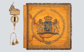 Vaandel, oranje, van het Landstormkorps Zuid-Holland West Hoornblazer wielrijdersafdeling vrijwillige landstorm Zuid-Holland West met fiets aan de hand, juli 1916 Vaandel, oranje, van het Landstormkorps Zuid-Holland West Vaandeltop van messing tbv de Nederlandse Krijgsmacht, Koningin Wilhelmina (1898-1948) horende bij vaandel van het Landstormkorps Zuid-Holland West Twee vaandelkwasten aan snoer horende bij vaandel van het Landstormkorps Zuid-Holland West