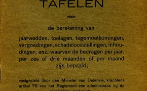 Voorschrift betreffende de berekening en uitbetaling van de bezoldiging van het personeel der 1e divisie : Ministeriële beschikking van 30 maart 1946, afd. BII, nr. … Tabellen voor de berekening van de aan weddegenietende militairen uit te betalen bezoldiging, enz. Ingaande 1 Januari 1957 / Koninklijke Landmacht en Koninklijke Luchtmacht Tafelen voor de berekening van jaarwedden, toelagen, tegemoetkomingen, vergoedingen, schadeloosstellingen, inhoudingen enz., waarvan de bedragen per jaar, per zes of drie maanden of per maand … Berekening van spillages